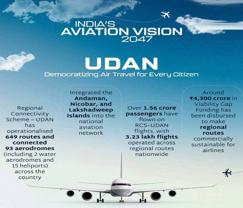 Under the Regional Connectivity Scheme (RCS)–UDAN, 649 routes and 93 aerodromes, including 2 water aerodromes and 15 heliports, have been made operational.