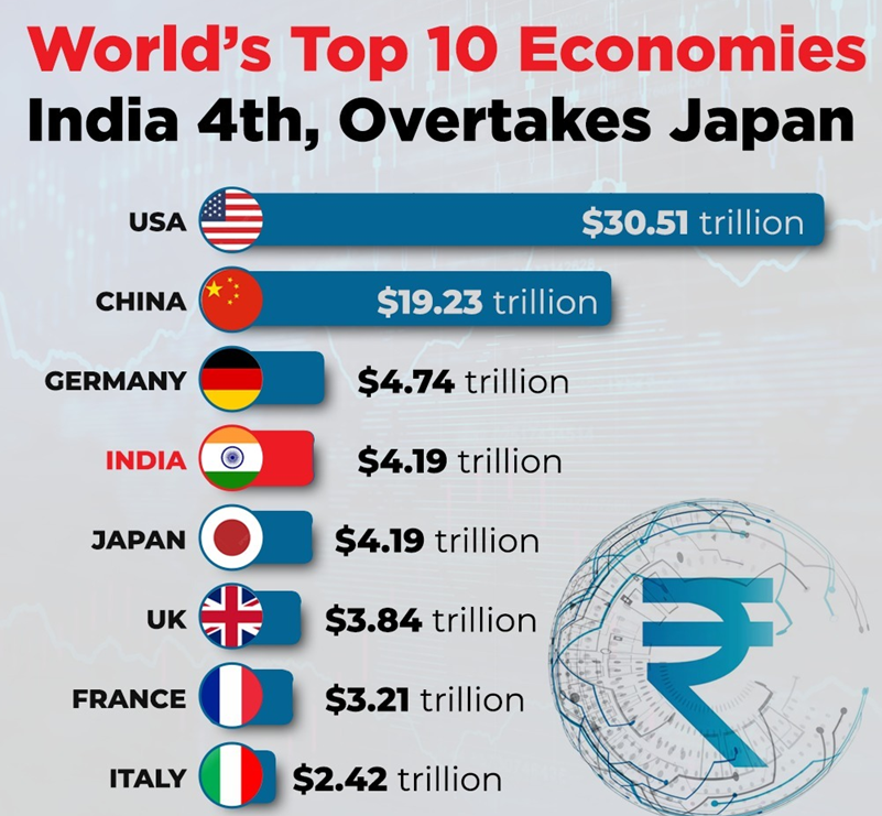 • India became the world’s fourth-largest economy in 2025, overtaking Japan, with a Gross Domestic Product (GDP) of $4.18 trillion.