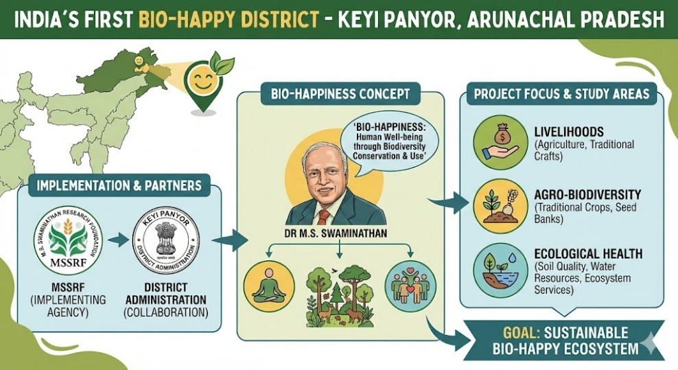 - Keyi Panyor district in Arunachal Pradesh is set to become India’s first Bio-Happy District.