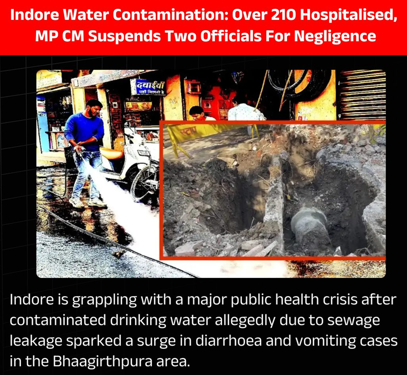 - The contamination occurred due to polluted drinking water supplied through municipal pipelines in the Bhagirathpura area of Indore, Madhya Pradesh.
