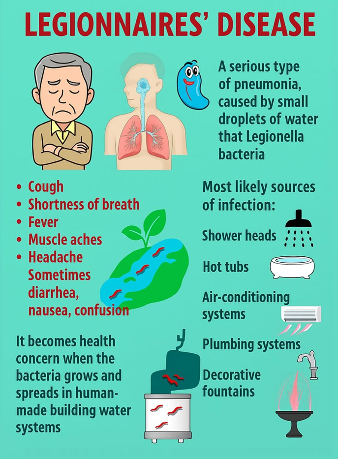 - It is a severe form of pneumonia caused by breathing in water droplets contaminated with Legionella bacteria.