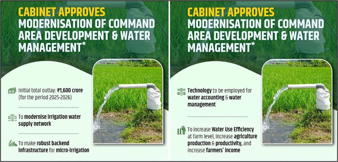 The Union Cabinet approved the ‘Modernisation of Command Area Development and Water Management (M-CADWM)’ as a sub-scheme of the Pradhan Mantri Krishi Sinchayee Yojana (PMKSY).