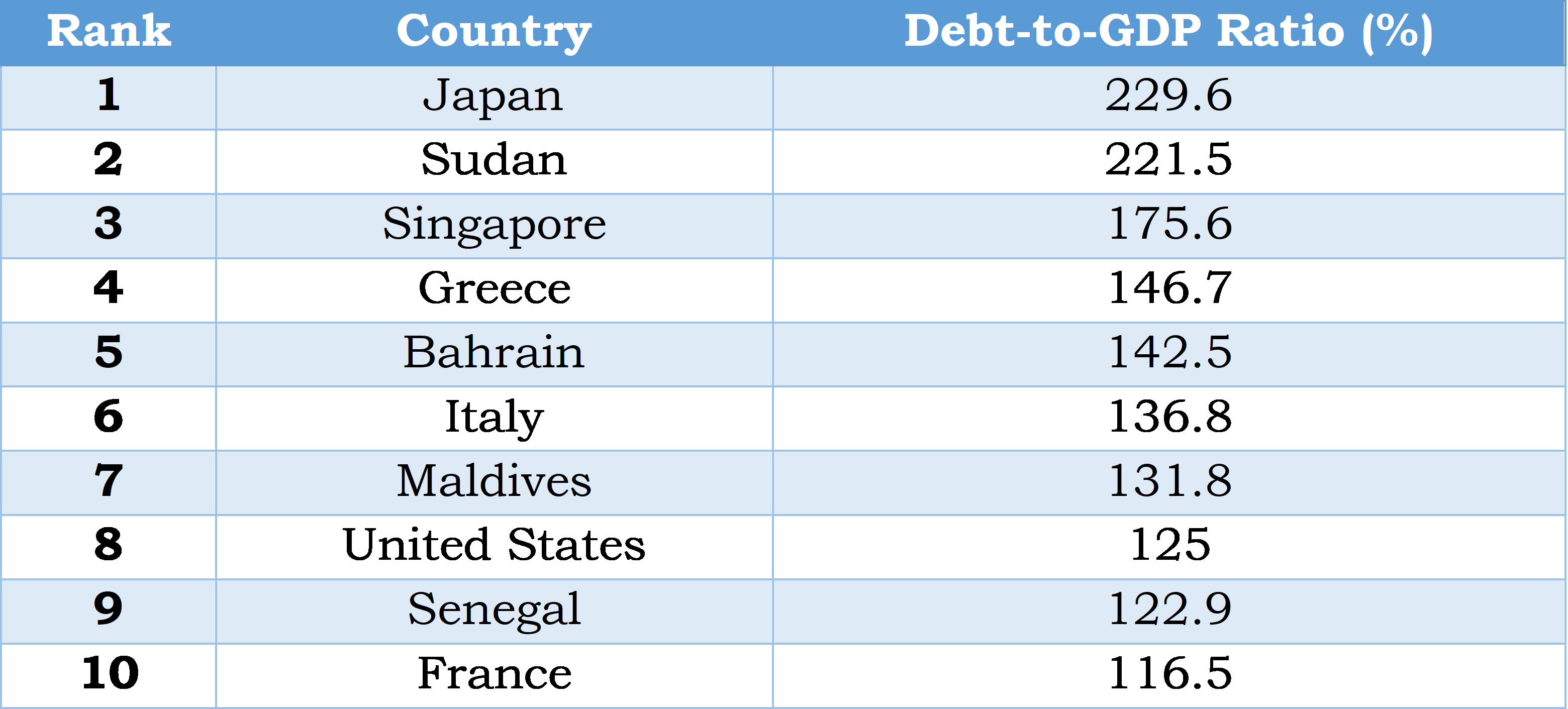 - The largest global economy, the US, ranks eighth globally with a high debt-to-GDP ratio of 125 per cent.