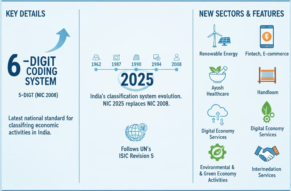 NIC 2025 reflects structural, technological, and organizational changes, covering sectors like renewable energy, fintech, e-commerce, Ayush healthcare, and handloom.