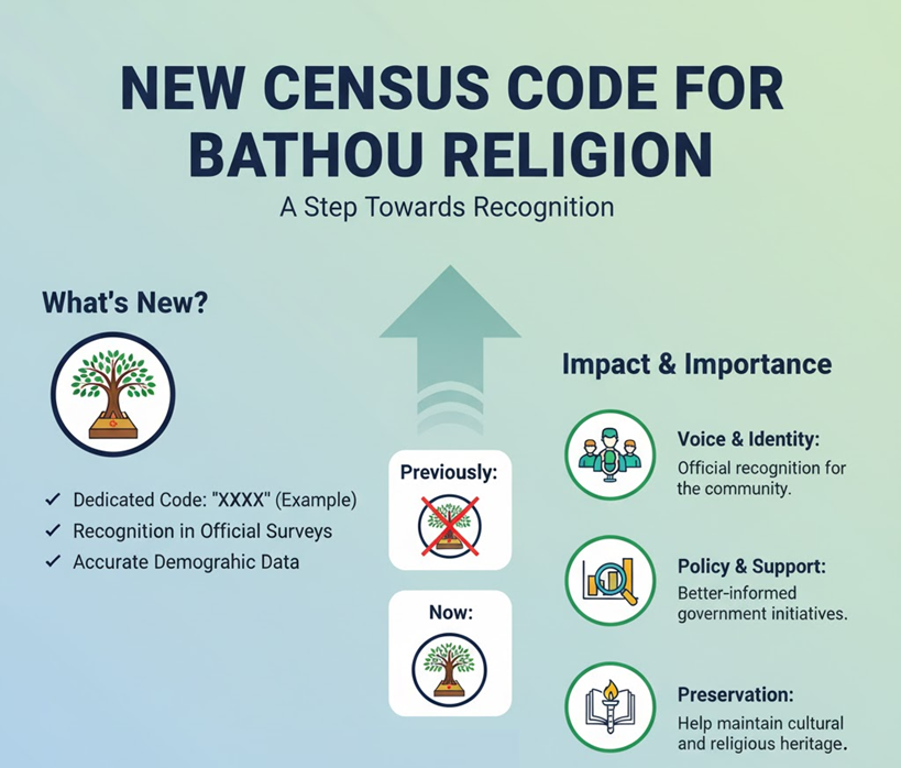 - The ancient Bathou religion of the Bodo community in Assam will receive a separate code in the upcoming Indian census.