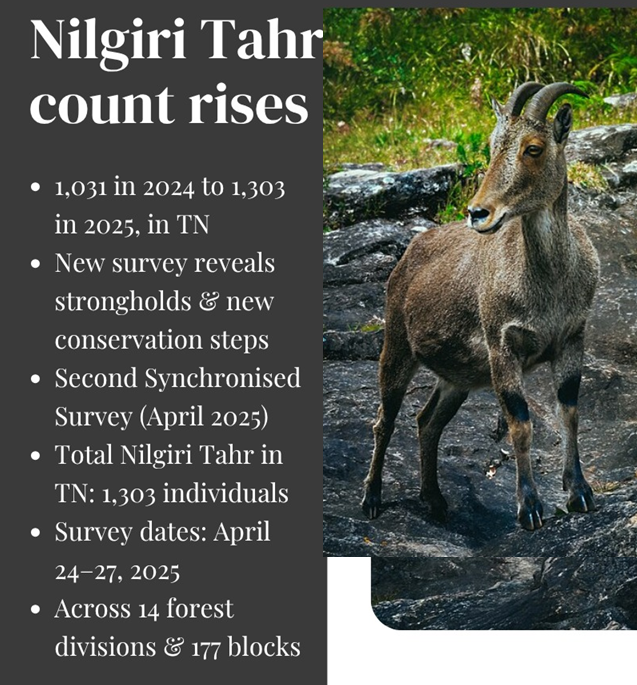 Tamil Nadu has conducted the third synchronized survey of Nilgiri Tahr, a state animal, under Project Nilgiri Tahr.