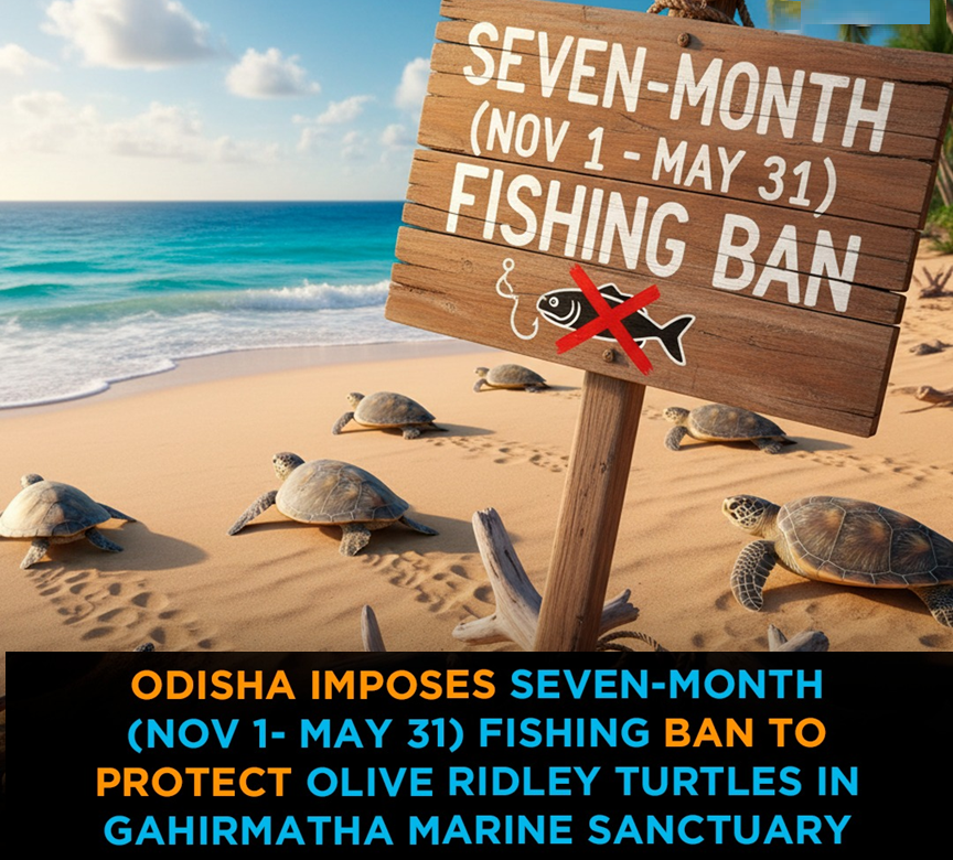 - A 7-month fishing ban is in effect from November 1 to May 31 in Gahirmatha Marine Sanctuary in Kendrapada, Odisha.