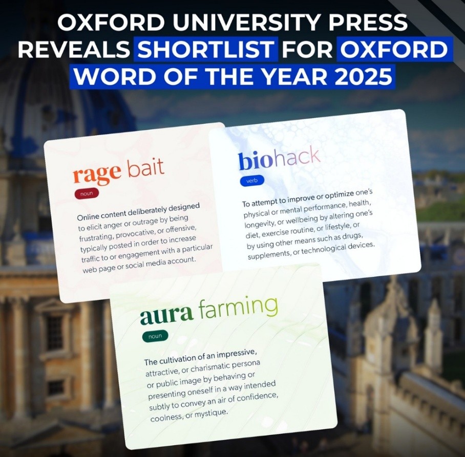 - The 2025 Oxford Word of the Year shortlist includes Aura Farming, Biohack, and Rage Bait.