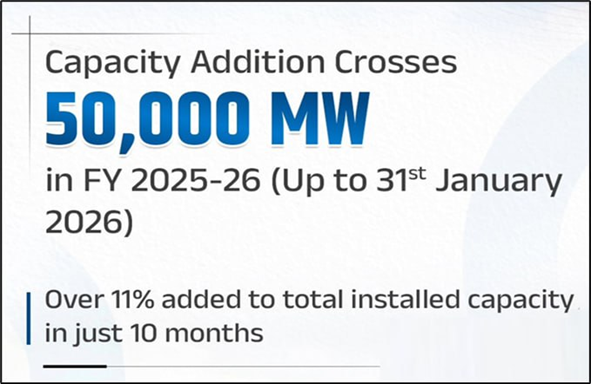 The Ministry of Power announced that India added 52,537 megawatts (MW) of power generation capacity in the current financial year up to January 31, 2026.