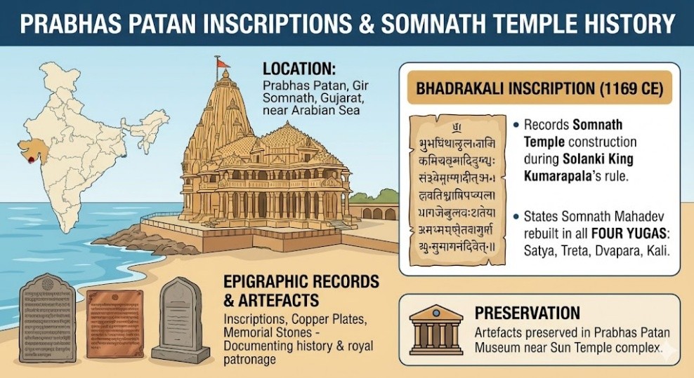 - The Bhadrakali inscription, dated 1169 CE, records the construction of the Somnath Temple during the rule of Solanki king Kumarapala.