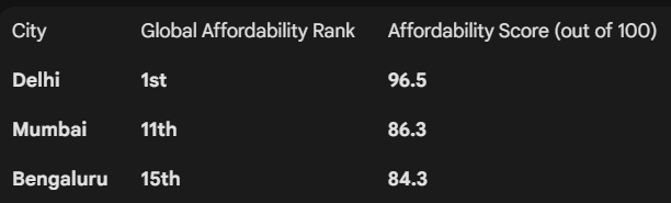 Mumbai ranked 11th, and Bengaluru ranked 15th in the affordability list.