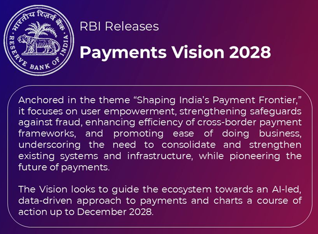 - The Reserve Bank of India released Payments Vision 2028, focusing on bank account portability.