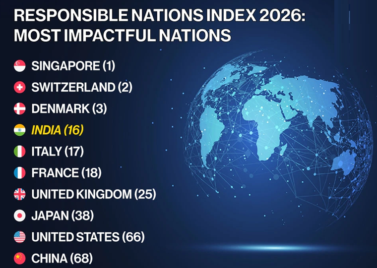 The Responsible Nations Index (RNI) 2026 was launched to assess how nations act responsibly towards citizens, the environment, and the global community.
