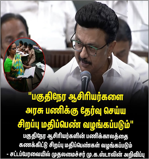 Tamil Nadu Chief Minister announced special marks for part-time teachers and an increase in pensions for several worker groups.