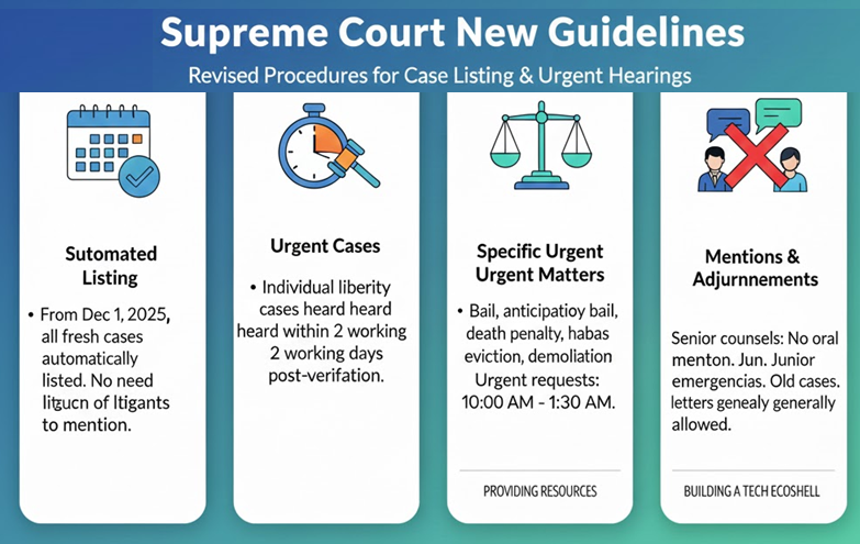 For bail, anticipatory bail, death penalty, habeas corpus, eviction/dispossession, and demolition cases, urgent requests can be made between 10:00 am and 10:30 am.