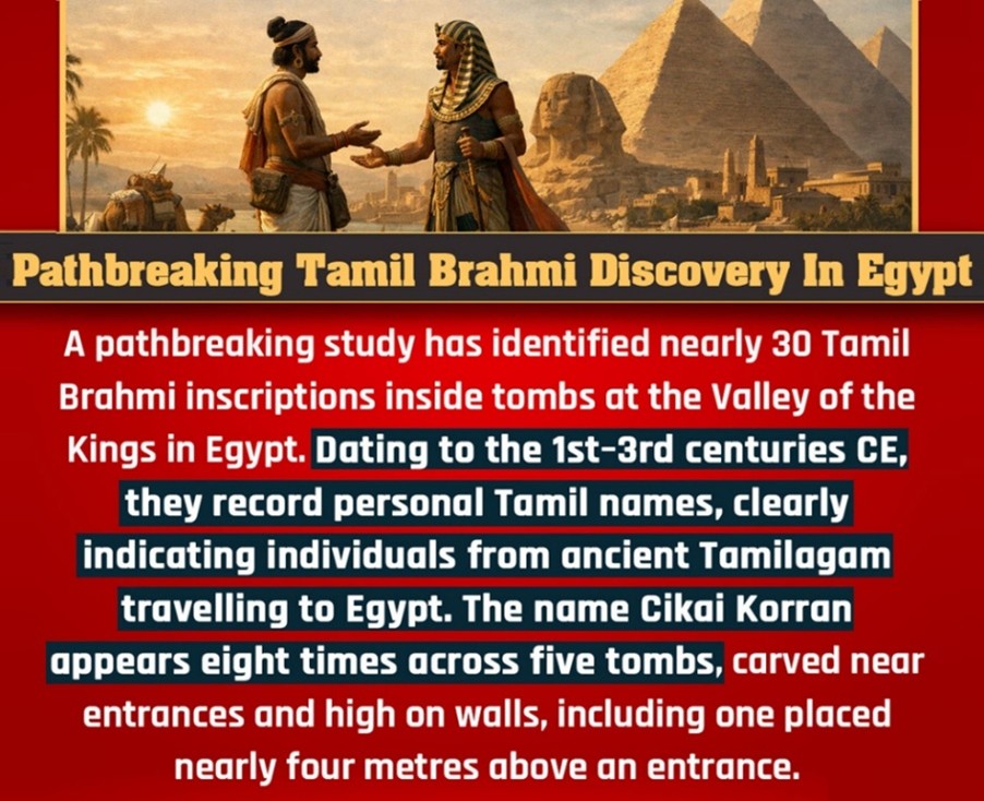 - Nearly 30 Tamil Brahmi inscriptions have been identified in Egypt’s Valley of the Kings, dating between the 1st and 3rd Centuries C.E.