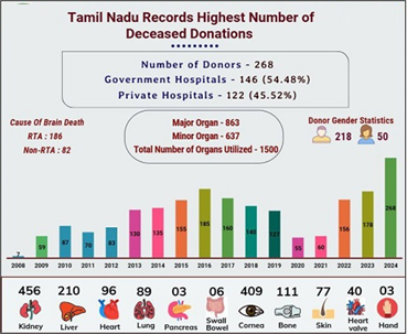 - In 2024, Tamil Nadu recorded 268 deceased donors, the highest ever for the State.