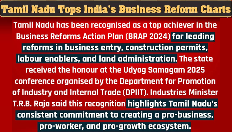 - Tamil Nadu was recognised as a top achiever in four parameters under the Business Reforms Action Plan (BRAP) 2024.
