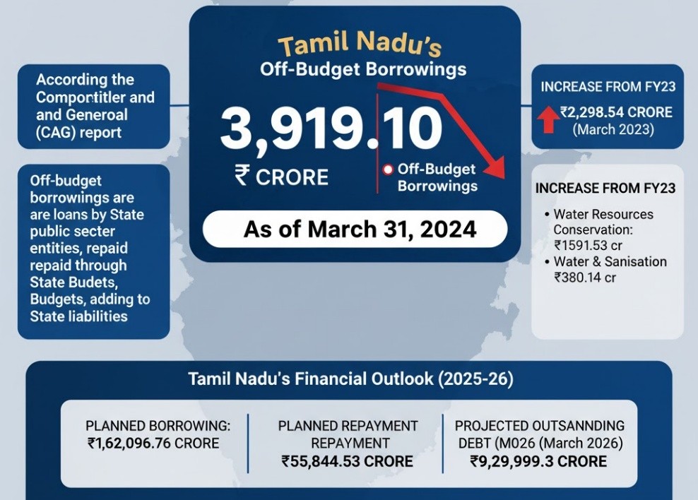 - Tamil Nadu’s off-budget borrowings stood at ₹3,919.10 crore as of March 31, 2024, according to the CAG report.