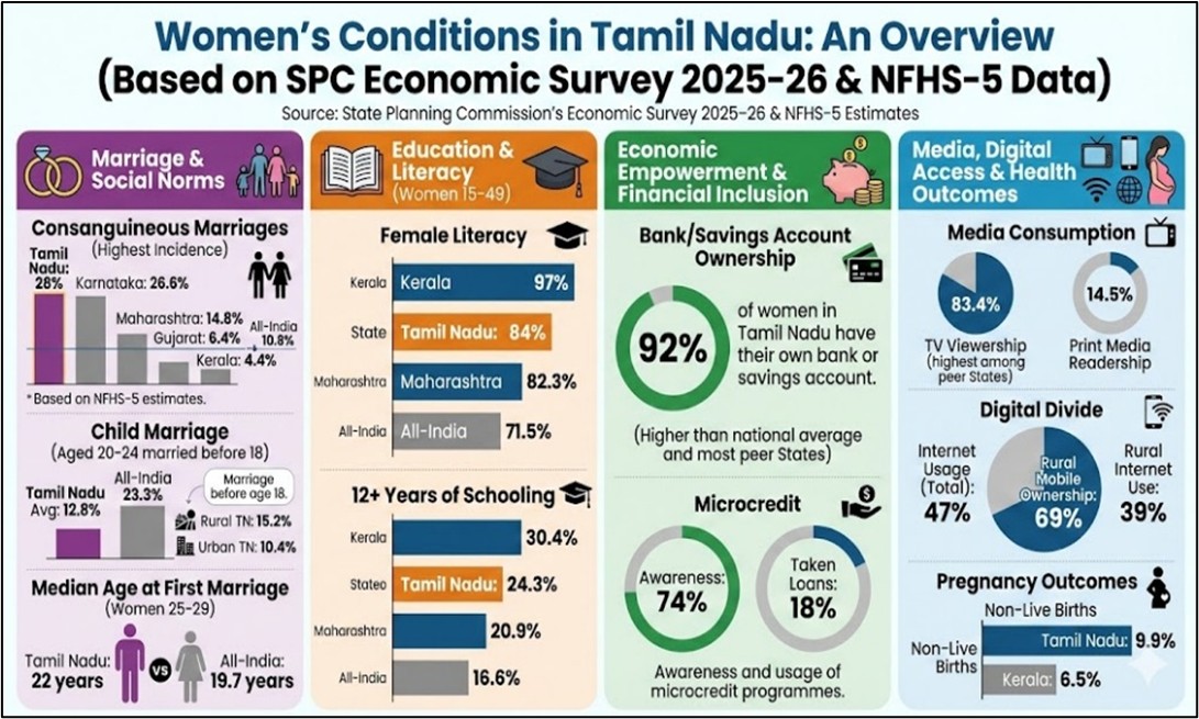 The Economic Survey 2025–26 of the State Planning Commission (SPC) highlights data on women’s social and economic conditions in Tamil Nadu.