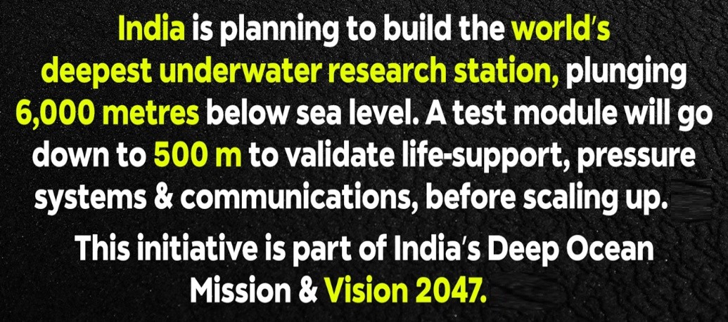 - India has announced a plan to construct a human-occupied underwater research laboratory at a depth of 6,000 metres in the Indian Ocean.
