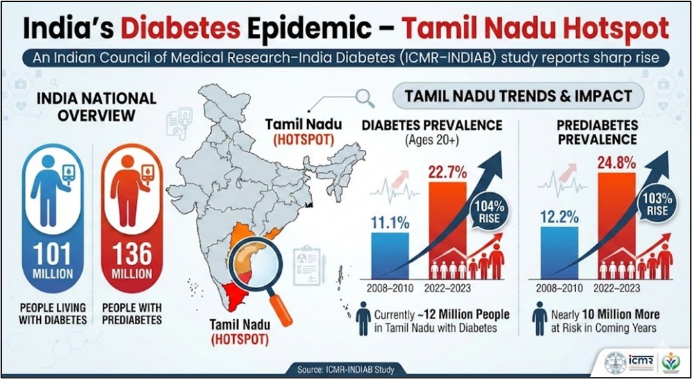 இந்திய மருத்துவ ஆராய்ச்சி மன்றம் – இந்தியா நீரிழிவு நோய் (ICMR–INDIAB) எனும் ஆய்வு, தமிழ்நாட்டில் நீரிழிவு மற்றும் நீரிழிவுக்கு முந்தைய நிலை நோய்களில் ஒரு பெரும் அதிகரிப்பு ஏற்பட்டுள்ளதாகத் தெரிவித்துள்ளது.