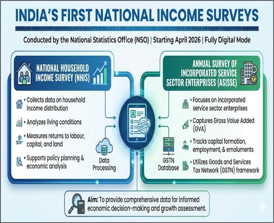 • தேசியப் புள்ளியியல் அலுவலகம் (NSO) குடும்ப வருமானம் மற்றும் பெருநிறுவனச் சேவைகள் குறித்த இந்தியாவின் முதல் நாடு தழுவிய ஆய்வுகளுக்குத் தயாராகி வருகிறது.