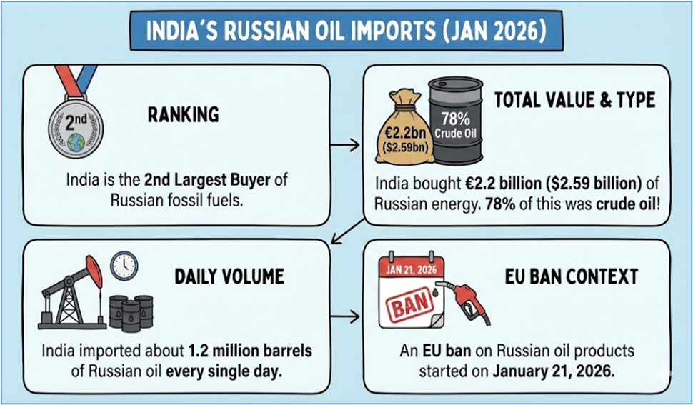 Centre for Research on Energy and Clean Air (CREA) வெளியிட்ட தரவுகளின்படி, 2026 ஜனவரியில் ரஷ்யாவின் புதைபடிவ எரிபொருட்களை வாங்குவதில் இந்தியா இரண்டாவது பெரிய நாடாகத் தொடர்கிறது.