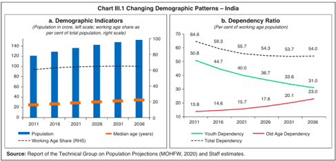 • இந்தியாவின் சராசரி வயது சுமார் 28 ஆண்டுகளாகும் என்ற நிலையில் உழைக்கும் வயதுடைய மக்கள் தொகை வரலாறு காணா உச்சத்தில் உள்ளது.