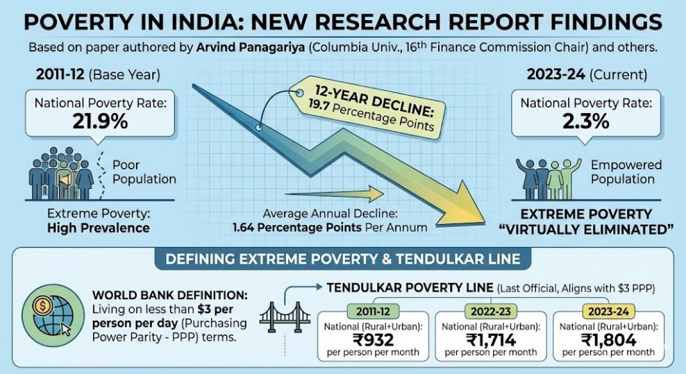 2011-12 ஆம் ஆண்டில் 21.9% (மக்கள் தொகையில்) ஆக இருந்த தேசிய வறுமை விகிதம் 2023-24 ஆம் ஆண்டில் 2.3% ஆகக் குறைந்துள்ளது.