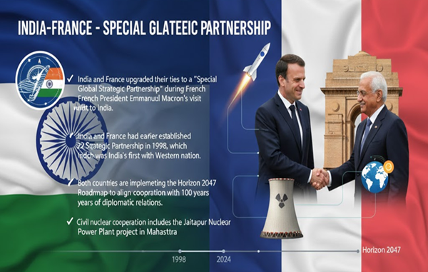 பிரெஞ்சு அதிபர் இம்மானுவேல் மக்ரோனின் இந்திய வருகையின் போது இந்தியாவும் பிரான்சும் தங்கள் உறவுகளை "சிறப்பு உலகளாவிய மூலோபாய கூட்டாண்மை"யாக மேம்படுத்தின.