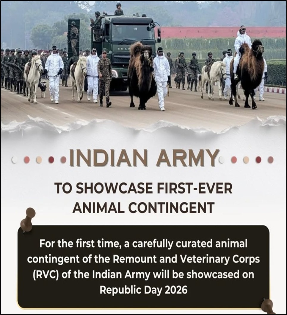 • இராணுவ கால்நடைப்பிரிவானது (RVC) 2026ஆம் ஆண்டு குடியரசு தின அணிவகுப்பில் முதன்முறையாக பங்கேற்றது.