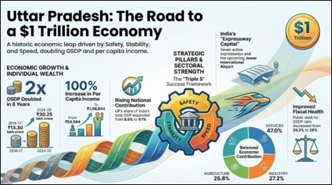 - உத்தரப் பிரதேசத்தின் மொத்த மாநில உள்நாட்டு உற்பத்தி (GSDP) 2025–26ல் ₹36 லட்சம் கோடியை எட்டும் என்று எதிர்பார்க்கப்படுகிறது.