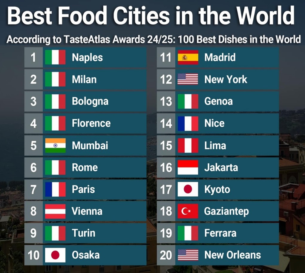 • நேபிள்ஸ், மிலன், போலோக்னா, புளோரன்ஸ், ஜெனோவா மற்றும் ரோம் ஆகிய இத்தாலிய நகரங்கள் முதல் 10 இடங்களில் முன்னிலை வகிக்கின்றன.