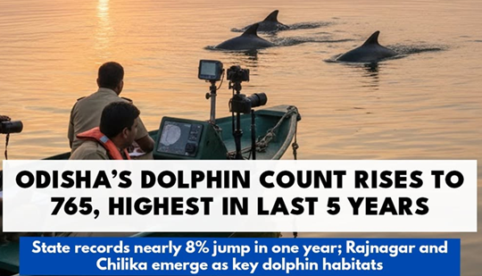 ஒடிசா ஐந்து ஆண்டுகளில் மிக அதிகமான கடல் ஓங்கில்கள் (டால்பின்) எண்ணிக்கையைப் பதிவு செய்துள்ளது என்ற நிலையில்2026 கணக்கெடுப்பில் 765 டால்பின்கள் கணக்கிடப்பட்டுள்ளன.