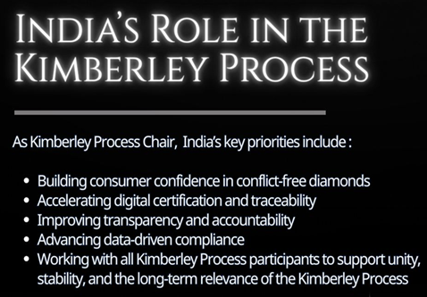 • உலகளாவிய வைர வர்த்தகத்தை ஒழுங்குபடுத்துவதற்காக கிம்பர்லி செயல்முறை சான்றிதழ் திட்டத்தில் சீர்திருத்தங்களை இந்தியா முன்மொழிந்துள்ளது.