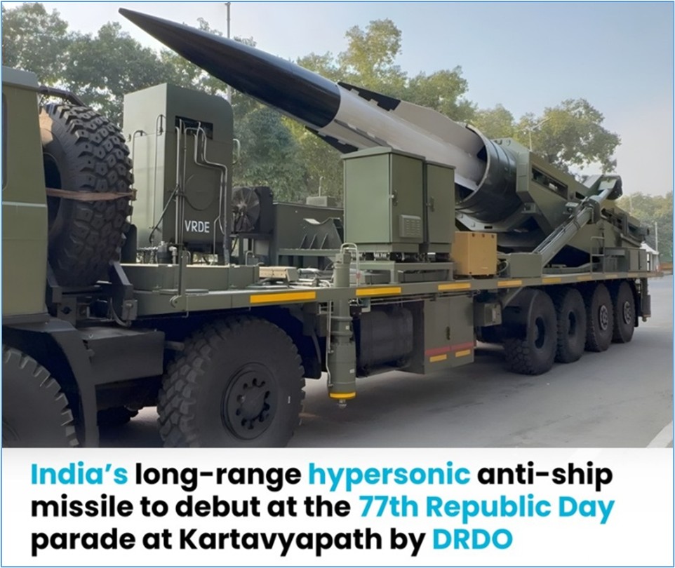 - DRDO அமைப்பானது, 77வது குடியரசு தின அணிவகுப்பில் LR-AShM அதிவேக இழைவியக்க ஏவுகணை அமைப்பை முதன்முறையாக காட்சிப்படுத்தியது.