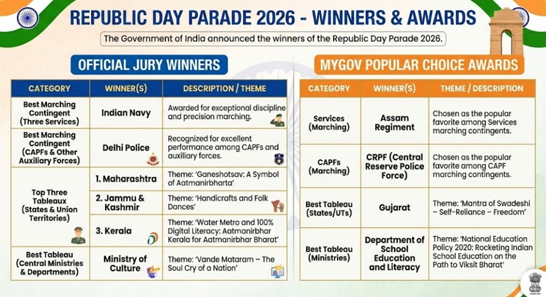 இந்திய அரசு 2026 குடியரசு தின அணிவகுப்பின் வெற்றியாளர்களை அறிவித்தது.