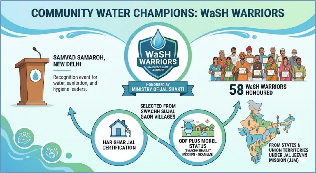• ஜல் ஜீவன் இயக்கத்தின் கீழ், மாநிலங்கள் மற்றும் ஒன்றியப் பிரதேசங்களைச் சேர்ந்த மொத்தம் 58 WaSH வீரர்களுக்கு கௌரவம் அளிக்கப்பட்டது.