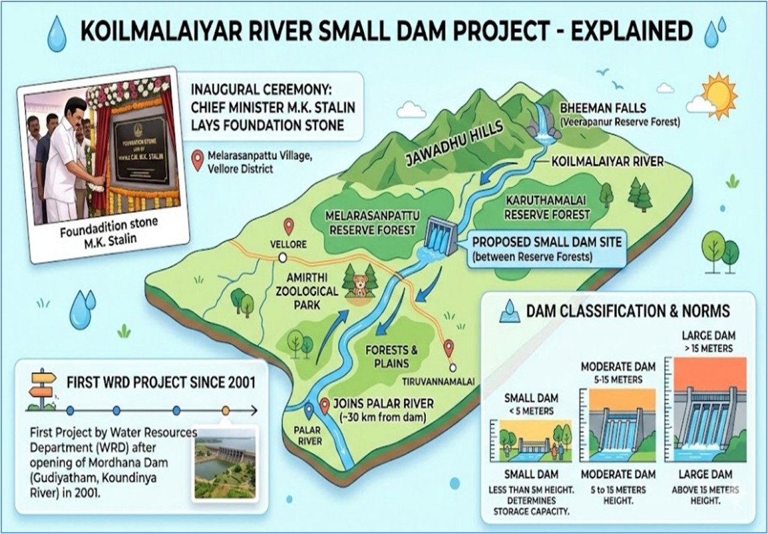 • வேலூர், மேலரசன்பட்டு கிராமத்தில் கோயில்மலையாற்றின் குறுக்கே ஒரு சிறிய அணைக்கு முதலமைச்சர் மு.க. ஸ்டாலின் அடிக்கல் நாட்டினார்.