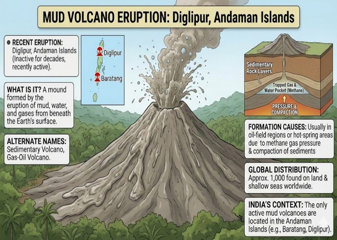 • அந்தமான் தீவுகளில் உள்ள திக்லிபூரில் சமீபத்தில் ஒரு சேற்று எரிமலை வெடித்தது.