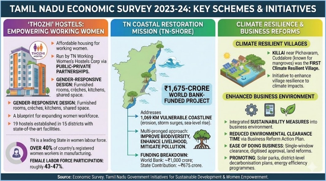 • தொழிலாளர்களுக்கான தமிழ்நாட்டின் 'தோழி' விடுதிகளை பொருளாதார ஆய்வு அறிக்கை சுட்டிக் காட்டியது.