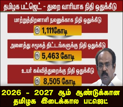 இந்த ஆண்டு நடைபெற உள்ள சட்டமன்றத் தேர்தலுக்கு முன்னதாக, 2026-2027 நிதியாண்டுக்கான இடைக்காலப் பட்ஜெட்டை நிதியமைச்சர் தங்கம் தென்னரசு தமிழக சட்டமன்றத்தில் தாக்கல் செய்தார்.