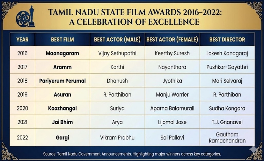 • 2016 முதல் 2022 ஆம் ஆண்டுக்கான மாநிலத் திரைப்பட விருதுகளை தமிழக அரசு அறிவித்துள்ளது.
