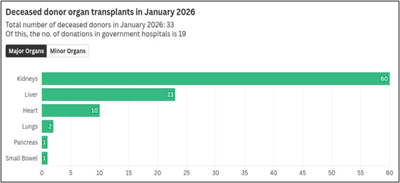 • ஜனவரி 2026 இல் 33 நன்கொடையாளர்களுடன் தமிழ்நாடு அதன் அதிகபட்ச மாதாந்திர இறந்த உறுப்பு தானங்களைப் பதிவு செய்தது.
