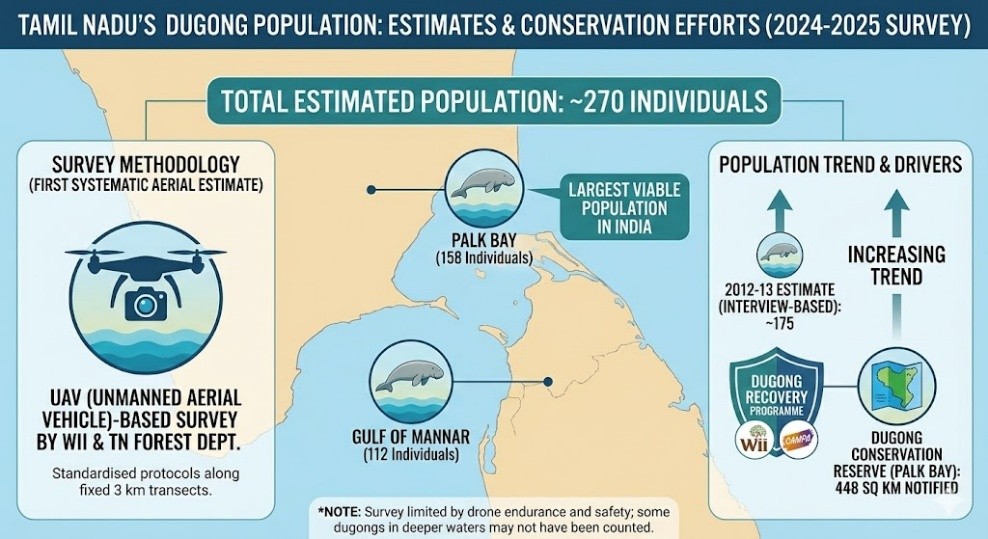 • தமிழ்நாட்டில் கடற்பசுக்களின் எண்ணிக்கை 270 ஆக மதிப்பிடப்பட்டுள்ளது.