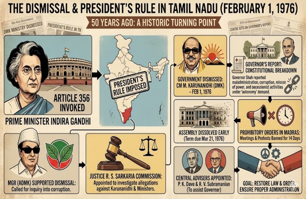 • 50 ஆண்டுகளுக்கு முன்பு, 1976 ஆம் ஆண்டு பிப்ரவரி 1 ஆம் தேதி, தமிழ்நாட்டு அரசாங்கம் வரலாற்றில் முதல் முறையாகப் பதவி நீக்கம் செய்யப்பட்டது.