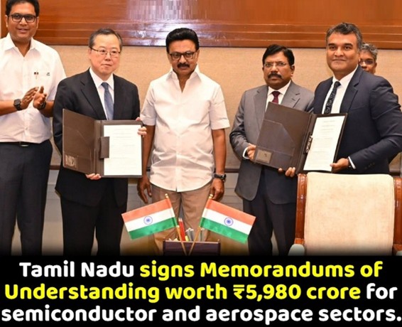 குறைக்கடத்தி மற்றும் விண்வெளி உற்பத்தியை ஊக்குவிப்பதற்காக தமிழக அரசு ₹5,980 கோடி மதிப்புள்ள புரிந்துணர்வு ஒப்பந்தங்களில் (MoU) கையெழுத்திட்டது.