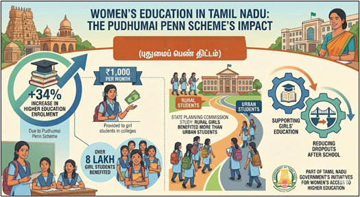 - புதுமைப் பெண் திட்டம் காரணமாக தமிழ்நாட்டில் உயர்கல்வியில் பெண்கள் சேர்க்கை 34% அதிகரித்துள்ளது.