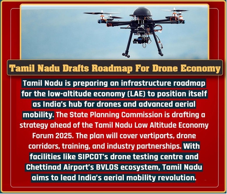 • தமிழ்நாடு அரசு, வான்வழி வாடகை வாகன நிலையங்கள் (வெர்டிபோர்ட்கள்), ஆளில்லா விமான வழித்தடங்கள், பயிற்சி வழித்தடங்கள் மற்றும் ஒழுங்குமுறை கட்டமைப்புகளை விவரிக்கின்ற தனது மாபெரும் திட்டத்தினை 2025 ஆம் ஆண்டு LAE மன்றத்தில் வெளியிட உள்ளது.